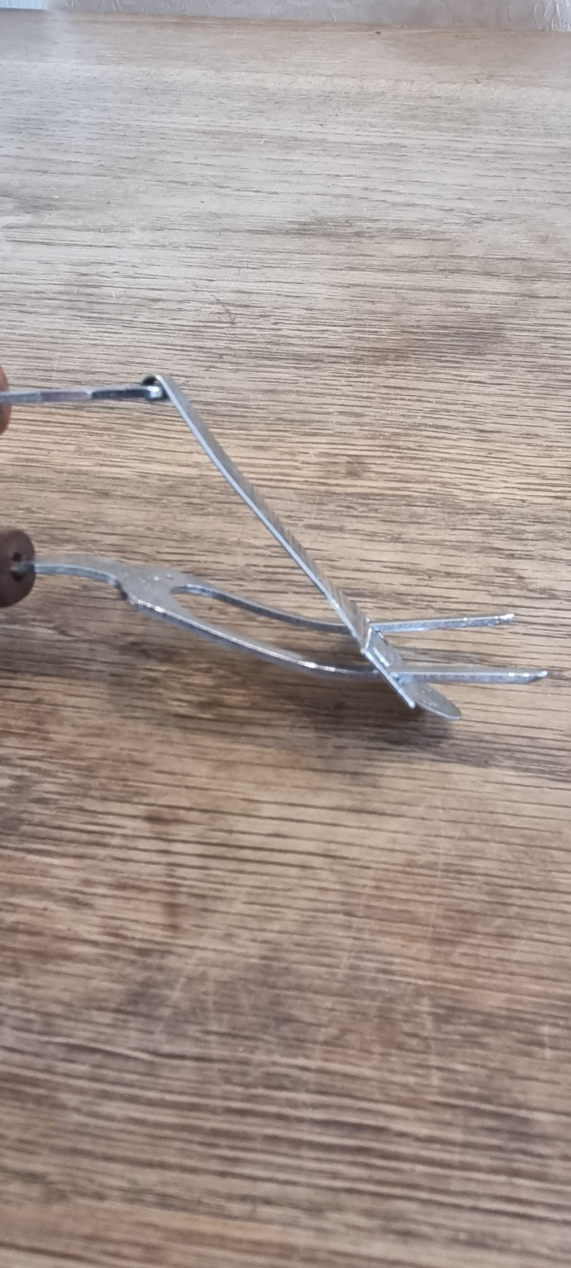 A really interesting find! Spring loaded serving fork with long prongs. When you squeeze the handles the slider moves forward pushing the food off the fork. Inspired.